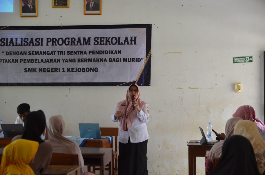 Pada sesi berikutnya, Kepala SMK Negeri 1 Kejobong Ibu Sri Retnoningsih, S.Pd., M.Pd. menyampaikan program sekolah yang menjadi panduan pelaksanaan kegiatan belajar mengajar dan pengembangan murid selama satu tahun ajaran. Materi ini memberikan gambaran tentang arah kebijakan, kegiatan unggulan, dan target pencapaian sekolah. Setelah itu, Wakil Kepala Sekolah Bidang Kesiswaan Bapak Hendrik Hartanto, S.Pd. menjelaskan SOP pelayanan siswa, yang berisi prosedur dan standar pelayanan untuk memastikan kenyamanan, keamanan, dan keberhasilan proses belajar murid di sekolah.